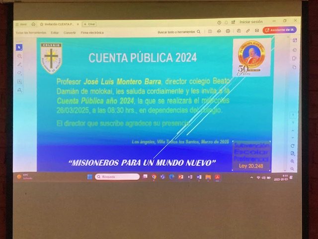 PRESENTACIÓN DOCUMENTOS INFORMATIVOS DE CUENTA PÚBLICA PERIODO AÑO 2024 26 de marzo de 202526 de marzo de 2025 Acta Cuenta Pública Beato Damián de Molokai periodo 2024 GESTIÓN ACADÉMICAActa Cuenta Pública Beato Damián de Molokai periodo 2024 GESTIÓN FINANCIERA