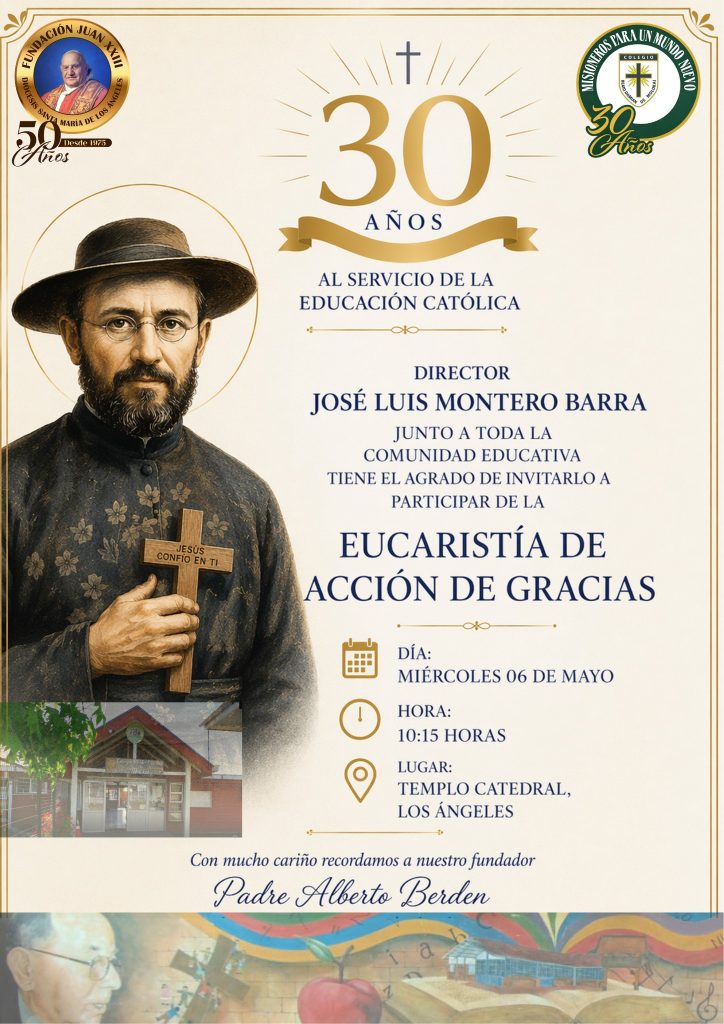 Invitación a nuestra Eucaristía de Acción de Gracias, celebrando nuestros 30 años al servicio de la formación católica en nuestra ciudad. MIERCOLES 6 DE MAYO 2026